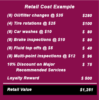 change of oil and filter by certified technicians, rotation of tires and discounts off major